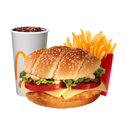 McChicken burger with fries and drink.